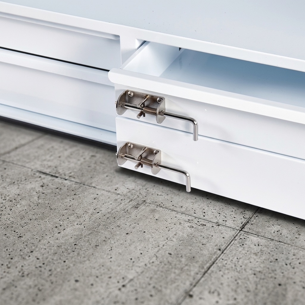 Spring-loaded latches on the left-hand side to secure internal drawers