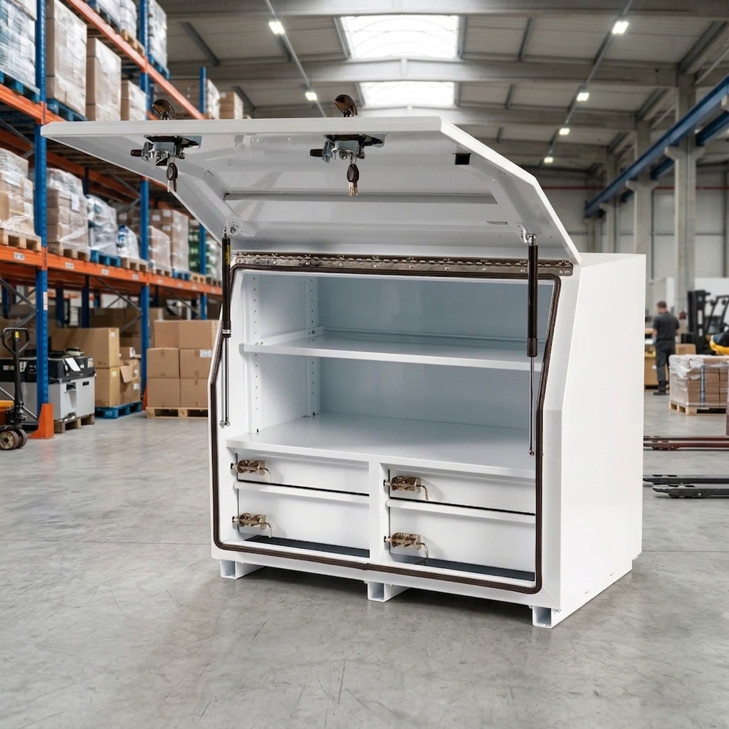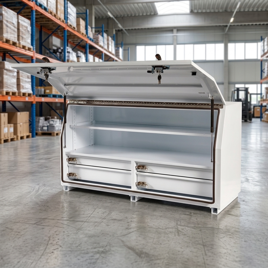 The 850H Series steel side-by-side 4 drawer minebox is a robust and practical storage solution, designed to keep tools and equipment organised in demanding work environments. With a combination of drawer storage and a spacious main compartment, it’s ideal for utes, trucks, and trade setups requiring both accessibility and durability.