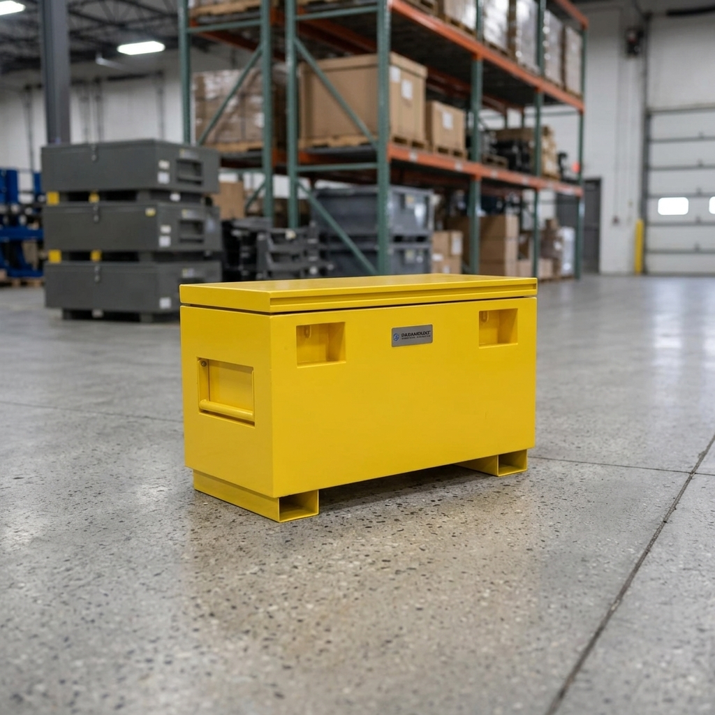 Our heavy-duty steel job site box offers robust and secure storage for tools and equipment, perfect for industrial and commercial use. With forklift access and optional castor wheels, this durable yellow toolbox is designed for easy handling and maximum convenience on the job site.